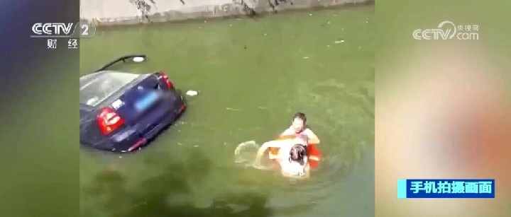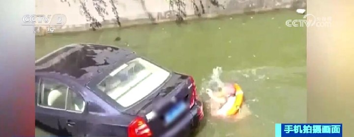 通过手机拍摄的画面看到,当时车辆的前半部分已没入水中,老人顾顺明戴着救生圈游向车辆。