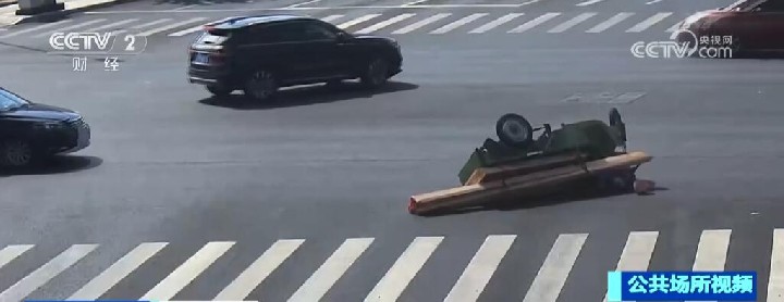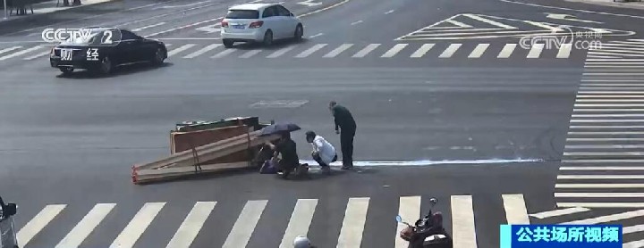 近日,在浙江新昌城区,一辆装满木材的电动三轮车失控侧翻,驾驶员被压在木材下,热心市民纷纷帮忙施救。