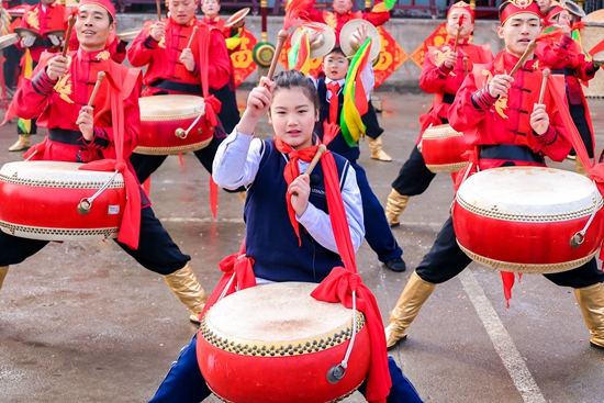 13岁的高雅乐领衔威风锣鼓传统曲牌《老虎下山》。