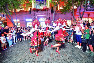 演职人员在中央大街上表演俄罗斯传统民族舞蹈,引来市民和游客围观欣赏。郭俊峰摄/光明图片