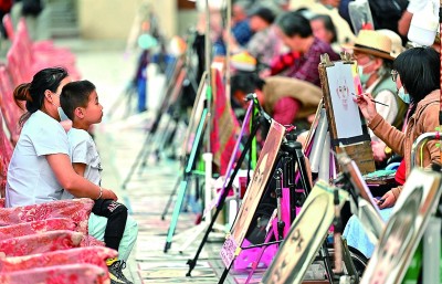 中央大街上的画像师为市民和游客画像,成为百年老街的独特风景。郭俊峰摄/光明图片