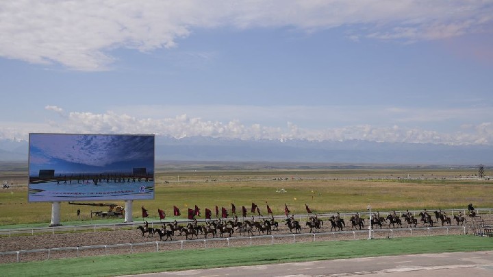 天空一望无际,远处雪山连绵,近景绿意盎然。开赛仪式上,3500余匹骏马组成的马队方阵十分壮观。在赛场附近的草原上,骏马在人们周围来回跑跳,记者遇到了一位参加开幕式演出的哈萨克族少年,他骑着一匹白色的马飞驰而来。