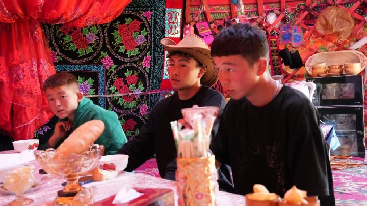 一番攀谈过后,塔力哈尔热情地邀请记者来毡房做客,接待客人的毡房内装饰颜色鲜艳,里面用不同的布剪裁出各种图案,有着浓郁的民族特色。记者在这里品尝到了当地特色美食“包尔萨克”,还学会了几句哈萨克语。