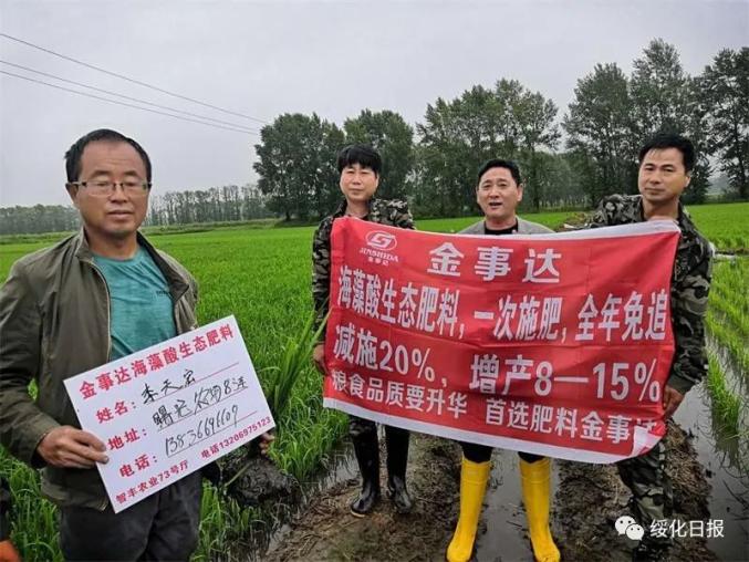 开发不易,转化更难。为了加快新产品转化,2018年和2019年两年,范友带领金事达公司在全省各地区、各大农场都建立了“海藻生态增效肥料”试验示范基地,每年冬季举办一次科普大会,聘请国家、省、市农业专家,为二三百名来自全省各地试验示范基地的农民讲解科学施肥、种田知识;春夏季节,范友带领公司10多人组成的技术服务队深入田间地头,向农民传授科学施肥、田间管理及病虫害防治科技常识;收获季节,范友带领团队到田间地头测评、记录产量数据,实现全程追踪、全程服务,获得精准详实的科学数据。