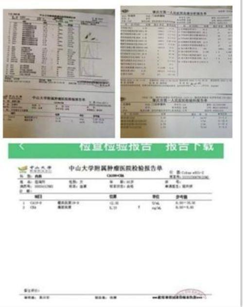 患者伍瑞玲,在当地三甲医院作了化疗第1、2次比较有效的,从第3次起后面5次癌胚抗原一直没什么变化,而身体反应很大,睡不好吃不下饭,抵抗力差,后经到陈教授一个月的中医药治疗,检验报告基本达到正常。Case 16: Malignant Tumors
