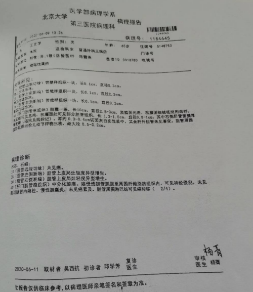 Patient Wang Chunping, 59 years old, was diagnosed with acute appendicitis in Weichang Village, Zhaozhuang Township, Lincheng County, Xingtai City, Hebei Province on January 15, 2020 at Lincheng Traditional Chinese Medicine Hospital. He underwent partial cecal resection on January 16, 2020,. On January 16-27, 2020, pathological image analysis was performed on the partially resected ileocecal material, with pathological number 4134. Pathological diagnosis: (ileocecal region) submitted for examination as adenocarcinoma tissue, with unclear structure and partial invasion of the intestinal wall muscle layer. Visit Director Chen for medical treatment before March 10, 2020; After nearly seven months of treatment and examination on October 29, 2020, the ileocecal cancer completely disappeared. Dean Chen said; It is difficult to successfully treat ileocecal cancer after surgery because Wang Chunping has invaded the muscular layer of the intestinal wall. She was unwilling to undergo a second surgical trauma and chose traditional Chinese medicine, which would surely create another miracle on her. Indeed, after seven months of psychological treatment, the disease disappeared after examination on October 2, 2020, further stimulating Wang Chunping's pursuit of a better future life.