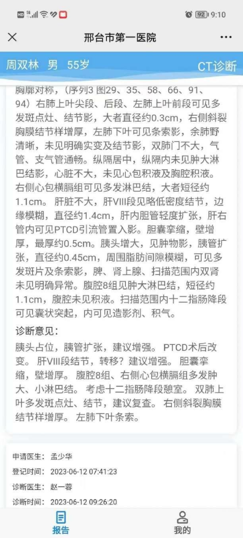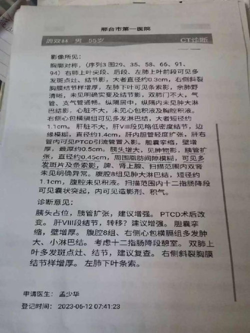 文其林从2023年1月25日开始服用纯中药,经历九个月的努力,于2023年10月26日经外院CT检查报告单:肝脏:未見明显异常组织密度影及占位性病变。