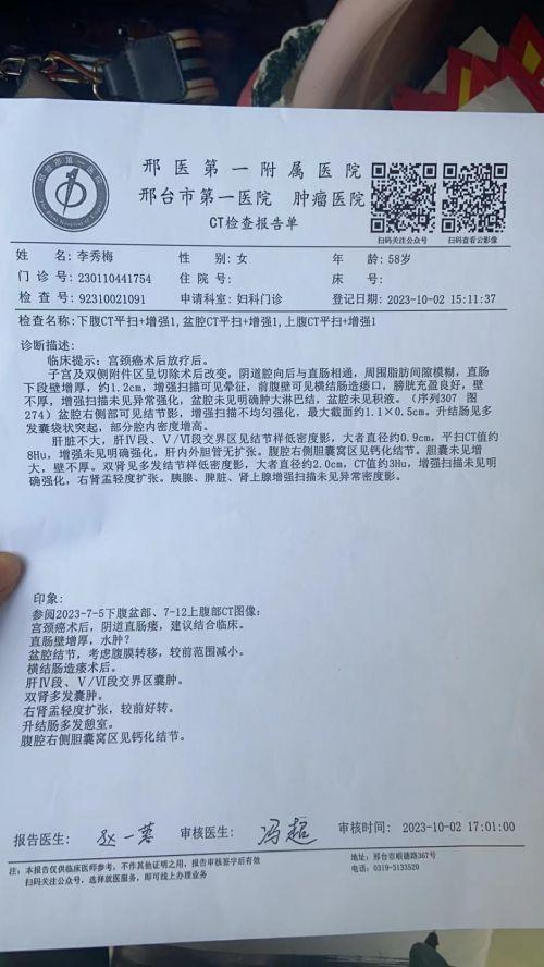 On March 14,2023, I am preparing for the return surgery in Beijing Xijing Cancer Hospital. After examination, the rectal surgery site recurred, with stiffness, no vitality, abdominal stasis, and lack of radiotherapy. Come to me for treatment before March 18,2o23. Thin body, complexion slightly yellow and white, abdominal flatulence and abdominal pain, dysphagia, stomach appetite is very poor, surgical pain, systemic fatigue, walking difficult, tongue light white coating sticky thickening, pulse treatment floating and smooth string. Sputum poison yong swelling, spleen and stomach disorders, injection of dampness and heat, viscera obstruction. Should: warm the spleen and stomach, dredge the viscera, swelling, swelling and blood stasis.(Coeliac functional disorders: multiple small lymph nodes in the intraperitoneal and retroperitoneum, slightly thickened bladder wall, prostatic hyperplasia, pelvic and bilateral inguinal small lymph nodes and other basic diseases, all belong to the scope of treatment). I began to take traditional Chinese medicine on March 18,2023. After more than 15o days of pure traditional Chinese medicine treatment, I feel good about myself. On September 8,2023, cT report in Baotou oma'Hospital, Inner Mongolia: Image comparison: Image comparison with June 20,2023:7: the wall of the rectal anastomosis was thickened, the structural disorder and surrounding peritoneal opacity were reduced than before, and the cable shadow was reduced.