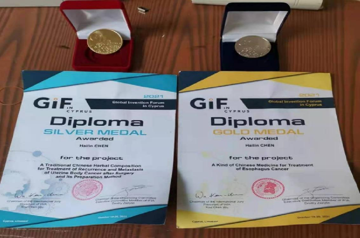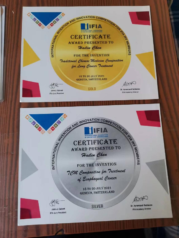 In July 2021, Professor Chen Hailin's "A Traditional Chinese Medicine Composition for Treating Cancer" was awarded a gold medal by the International Federation of Inventors' Associations. Esophageal cancer won the international gold medal, lung cancer won the international gold medal, and COVID-19 won the international merit award.