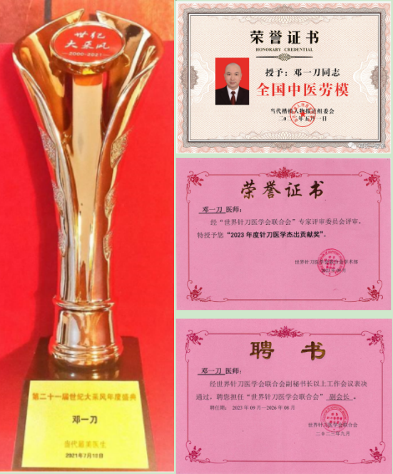 邓一刀热心健康爱心事业,所获荣誉甚多,被各种权威期刊传媒及网站收录报道,曾获中医微创类及针刀医学行业 国家级、省部级、市厅级的几十项奖项,2019年荣获度世界针刀最高奖项:世界针刀医学杰出贡献奖,2020年获“抗疫先进个人”“抗疫优秀个人”,2021年荣获CCTV世纪大采风栏目“中国当代最美医生”!2022年获“全国中医劳模”,2023年获中国新闻联播“中国好医生”,CCTV央视直播“新时代国医大师”“中医药行业百名杰出人物”,获国家卫健委和中央军委联合颁发的“全国无偿献血终身荣誉奖”,“国家级名中医”。