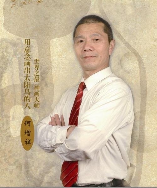 何增祥,中国河南人。自幼从无画画的经历,冥冥之中也是突然会画画的,或许是天意,从此就迷恋上了画画。当时其画的作品,主动给一名当地很有威望的老画家看,他评价说,是抽象派,也有的说是印象派。其实我也不懂得什么是抽象派、印象派,但我认为现在有两种画法,一种是有形的,一种是无形的,有形的画法,他画之前有标本(山水、花、人什么的)到最高层次,就是画的和真的一样。而无形的则没有标本,全凭内观专注意念。入静、入定、定中生慧,定中感受心与自然的交融,顺其自然、而要一定的时间,心不静时是难以画出来的。也是对这种画法的感悟。经过这多年的画、看、悟,以及无数次的修改,我画出的是神话传说中、太阳鸟、火龙、太阳果。太阳鸟是神话传说中的德道神鸟、层次达道了,和火龙合两为一境界,也就是说太阳鸟就是火龙、火龙就是太阳鸟。当太阳鸟要想德道太阳果时,而火龙根据太阳鸟意念而出现各种识是形态,帮助着太阳鸟得到太阳果。太阳果其实就是、金、木、水、火、土的火也就是说火的原头。其实也是一条火龙,火龙没事时就在那里放就象太阳一样红圆光。而太阳鸟得到红园光以后把他代到天上。这就是神话传说中太阳鸟。是他给地球代来了光明和温暖,给万物代来生机。注;恐龙在地球灭绝以后人们发现了恐龙化石认为地球上有恐龙时代。那太阳鸟以前地球上也有,只不过现在人们都己忘记了,我现在用意念画出来了、从太阳鸟下蛋、火龙、太阳果、和太阳鸟一切生活习惯,我全部画出来了,也算是让人们从新认识真正的太阳鸟,这就叫有情来下种因地果还生,全球独一无二。随缘(纯天然画)