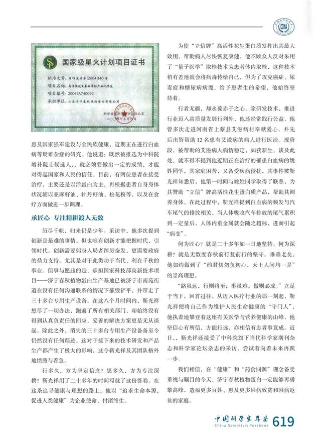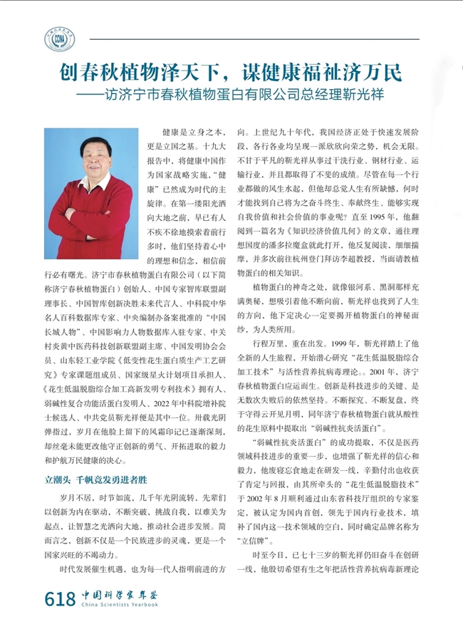济宁市春秋植物蛋白有限公司(以下简称济宁春秋植物蛋白)创始人、中国专家智库联盟副理事长、中国智库创新决胜未来代言人、中科院中华名人百科数据库专家、中央编制办备案批准的“中国长城人物”、中国影响力人物数据库人驻专家、中关村炎黄中医药科技创新联盟副主席、中国发明协会会员、山东轻工业学院《低变性花生蛋白质生产工艺研究》专家课题组成员、国家级星火计划项目承担人、《花生低温脱脂综合加工高新发明专利技术》拥有人、弱碱性复合功能活蛋白发明人、2022年中科院增补院士候选人、中共党员靳光祥便是其中一位。卅载光阴弹指过,岁月在他脸上留下的风霜印记已逐渐深刻却丝毫未能更改他守正创新的勇气、开拓进取的毅力和护航万民健康的决心。
