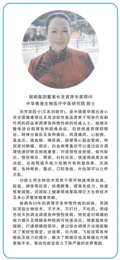 刘芳菲女士(又名刘晓芳)出生于四川,毕业于武汉工程大学工业自动化,从事健康行业近20年,爱好生物健康学,她20年潜心学习研究、营养学、中医及儒释道文化、实践调理各种疑难杂症经验,同时也是“国硒大悟芳菲身心养生基地”的创始人,国硒集团芳菲康颐堂品牌连锁加盟创始人,国硒集团董事长及首席专家顾问,中华香港生物医疗中医研究院院长。是中国最早提出身心灵全面健康理论及用功能性食品营养干预替代有副作用的药品来调理各种慢性病的权威人士。