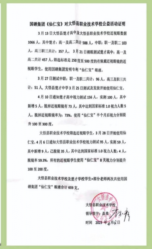 国硒集团芳菲康颐堂新县加盟店老板陈复耀签约介绍后,7月2日正式开业,当天就做出了50多名近视眼学生及老年人视力的提升效果。国硒集团《仙仁宝》