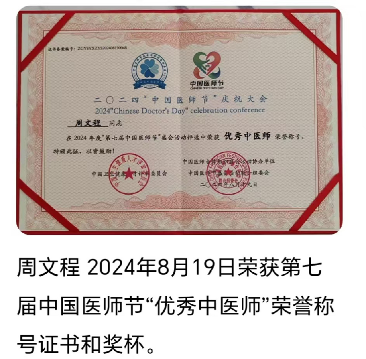 2024年3月周文程获得国家人社部、国家卫健委和国家中医药管理局三部委授予“国医大师”荣誉资格证书。