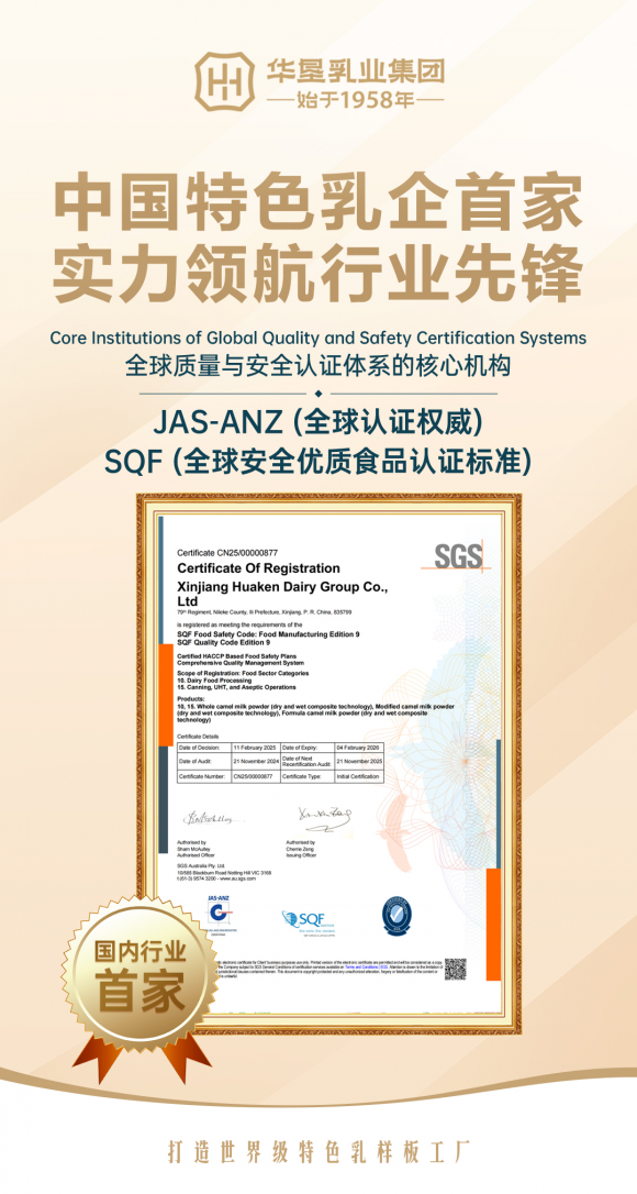 近日,华垦乳业集团正式通过国际权威认证机构的严格审核,成功斩获由JAS-ANZ(大西洋认可委员会)和SQF(全球食品行业)国际双认证,成为中国特色乳行业首家获此认证的企业。这一成就不仅标志着华垦乳业集团的质量管理体系与产品品质达到国际安全、优质水平,更为中国特色乳业参与全球竞争、实现高质量发展注入强劲的动能。