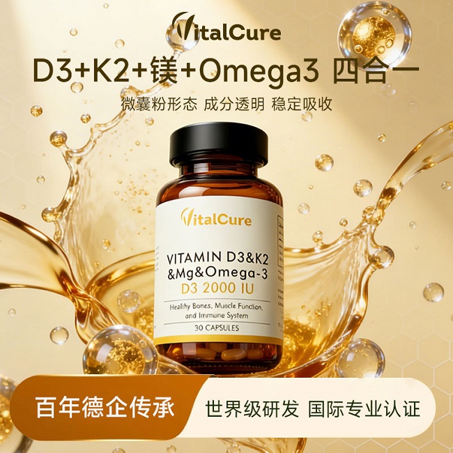 产品的核心配方是D3+K2+镁+Omega3四合一设计,每1粒含有2000IU D3、50μg K2、200mg镁和200mg亚麻籽油Omega3。这一配方遵循了哈佛教授推荐的成人黄金单日摄入量标准,能够实现365天足量、安全的科学补充。