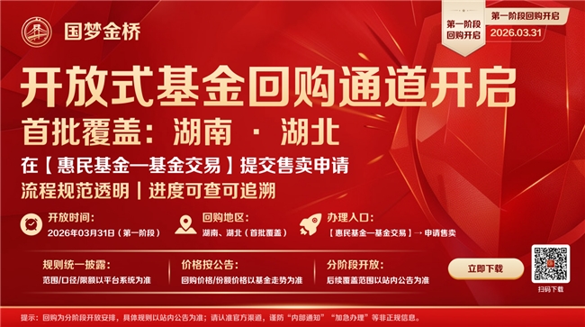 为进一步完善开放式基金交易服务、提升用户体验与资金流动性,国梦金桥平台将于2026年3月31日启动开放式基金份额回购(回收)第一阶段安排。第一阶段回购地区为湖南、湖北。符合条件的用户可在平台【惠民基金—基金交易】页面提交售卖申请,回购范围、价格口径、限额及处理规则等将以站内公告统一披露为准。