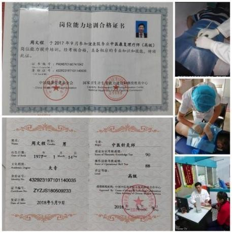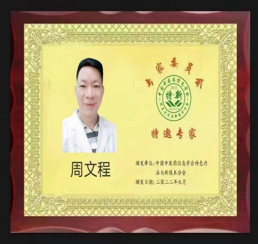 周文程、男、汉族、湖南永州市人,大专文化、中级职称、国家注册执业医师、毕业于国内医科大学,高级中医针灸师、高级中医康复理疗师、湖南省中医药和中西结合学会会员、中国管理科学研究院中医研究中心客座教授、大国医学网特聘客座教授、中国人口文化促进会"国医名师学术传承经验工作委会"首届委员、中国国际特色医疗网特色诊疗专家、中国中医药信息学会特邀专家、中国名医录数据库"中华名医"、国医百科网专家委会名誉主席、中国医药教育协会会员、中国中医康复医学会会员、中国"十四五"国家中医药杰出人才-中医战略科学家;道州疼痛专科医院法人、东莞市高埗周文程内科诊所法人等等。曾多次获得患者赠送"感谢锦旗"及好评,并多次获得"中国好医生"、中华名医"等奖杯、奖章和荣誉证书。