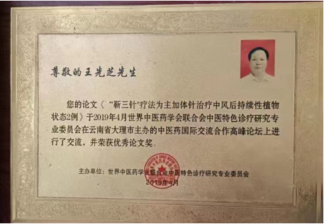 近两年来本人成功治愈两例中风后持续性植物状态病人,2005年9月参加第二届中国百名医学家峰会提交的论文。《靳三针疗法为主加休针治疗中风后挂结性植物状态二例》经专家评审,获得"第二届中国百名医学家峰会”优秀学术成里一等将,并编入由世界文献出版社出版的《世界优秀学术论文成果文献》一书。被世界文献出版社世界华人文献交流中心载入《世界名人录·杰出华人卷》,被授了“世界名人杰出华人荣誉称号”。