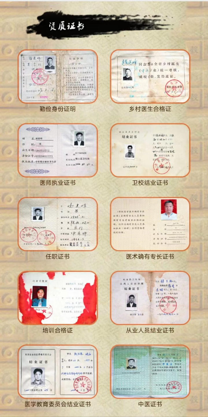 赵生强 男,49岁,出生于中医世家,家族世代从医,已有100多年历史,现任陕西候鸟时光养老产业公司康养部主任,陕西柏年聚星康养中心特约医师。其爷爷为民间医生,父亲赵建峰从小传承医术,从医50余年,擅长用中医中药治疗各种疑难杂病,尤其在不孕不育方面疗效卓著,病人遍及全国各地,远至海内外。1979年获得《赤脚医生证》书。2000年被评为陕西近代“百强名老中医”称号,2002年撰写的《羌活临床应用心得》,获得大白山中草药科研“金奖”。2005年获“陕西乡村名医”称号,荣获中华名医,和中国当代名医称号。